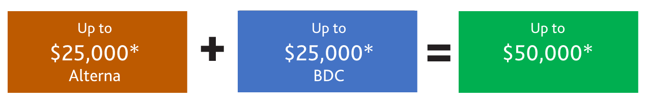 * Loans from Alterna Savings and BDC may be up to $25,000 each. This amount will be determined on a case by case basis and is not guaranteed.